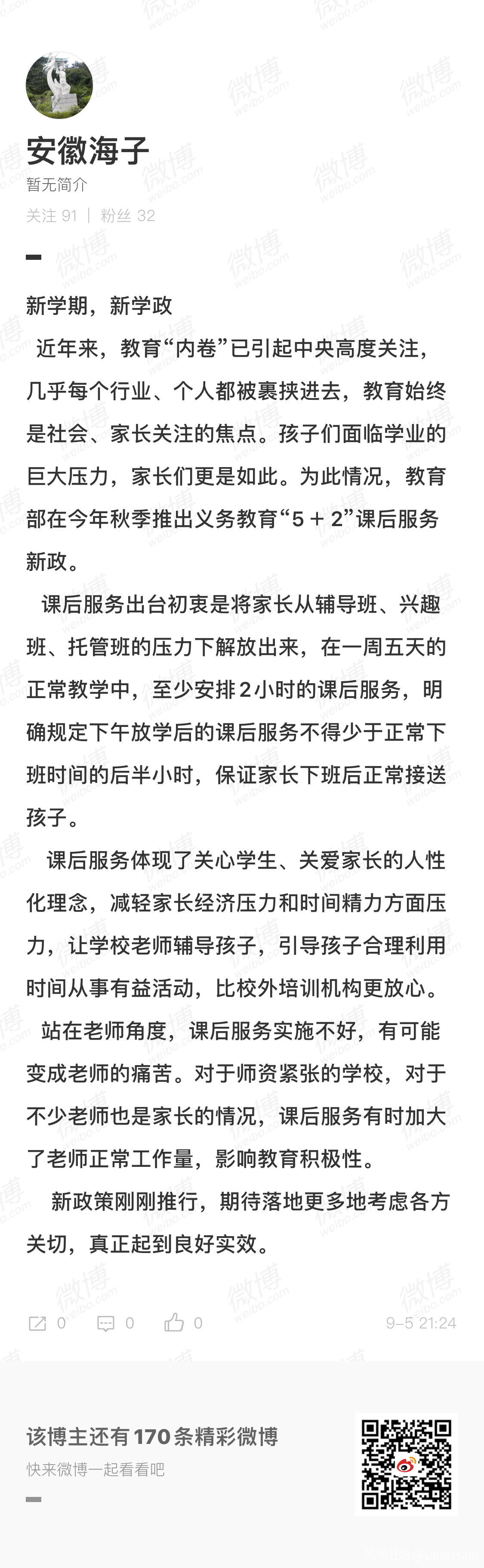 也就是一週5日,每日至少2小時,學校需要提供作業輔導和素質拓展服務,學生可自願參加。