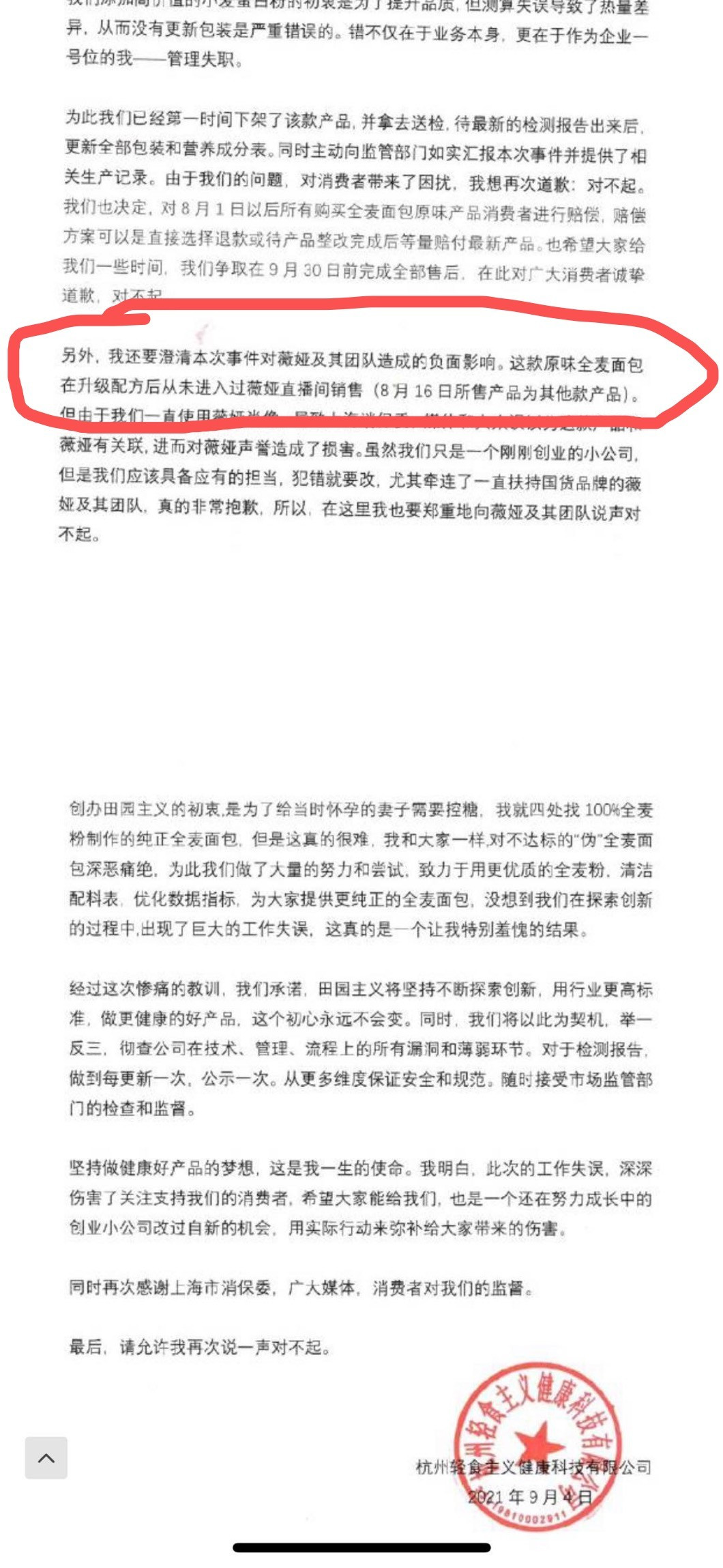 對於聲譽受到影響的薇婭團隊,田園主義品牌創始人朱江濤誠懇道歉:“由於田園主義未經薇婭團隊同意,一直使用薇婭肖像,導致上海消保委、媒體和大眾誤以為這款產品和薇婭有關聯,進而對薇婭聲譽造成了損害。”