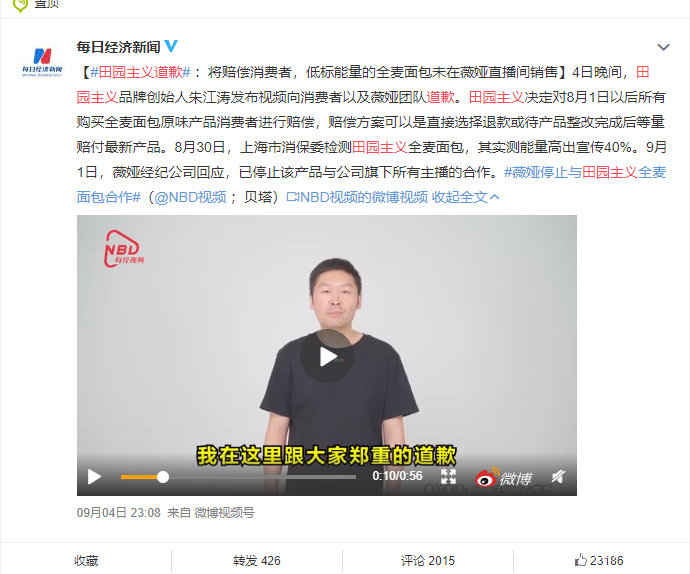 9月4日晚,田園主義品牌創始人朱江濤發佈視頻向消費者以及薇婭團隊道歉。次日,#田園主義道歉#衝上微博熱搜榜前三。