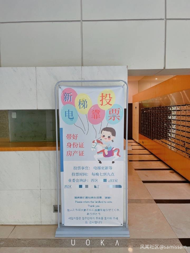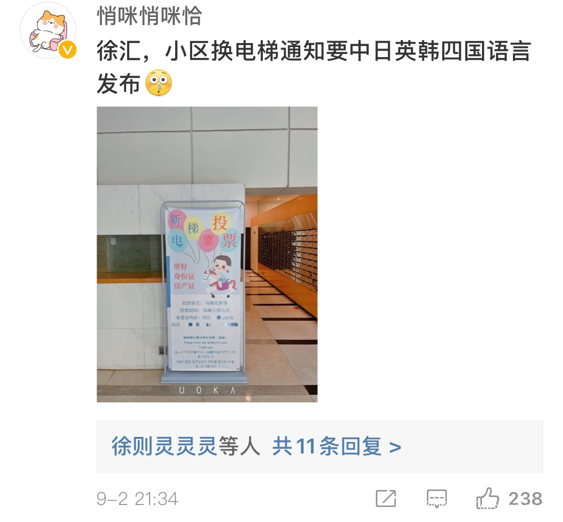 同理,網友拍的徐匯一小區換電梯通知涵蓋了中日英韓四國語言。