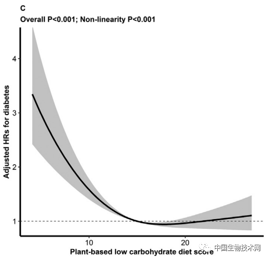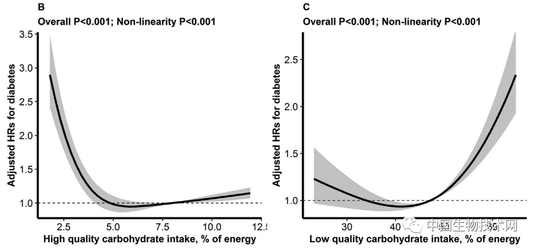 高質量碳水化合物攝入與新發糖尿病之間存在L型關聯;低質量的碳水化合物攝入與新發糖尿病存在J型關聯(見下圖);