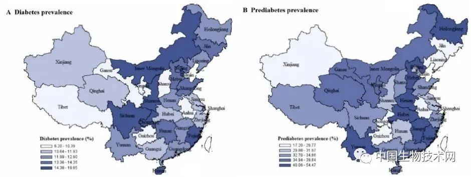 全國糖尿病(A)和糖尿病前期(B)發病率地理分佈,顏色越深,患病率越高