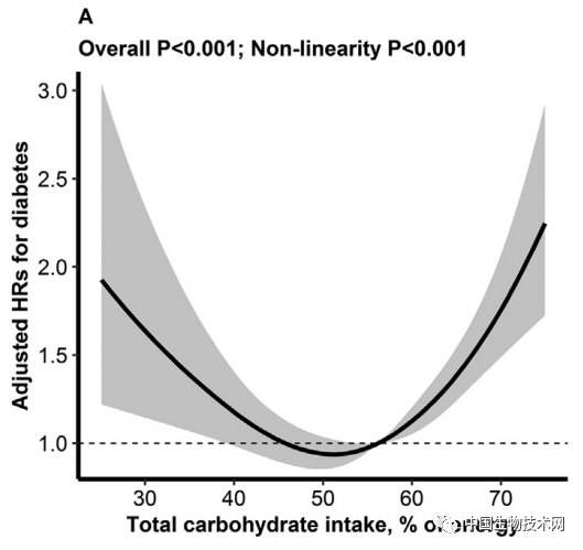 總的來説,碳水化合物攝入的能量百分比與新發糖尿病之間存在U型關係,攝入在49-56%時,新發糖尿病的風險最低(見下圖)。