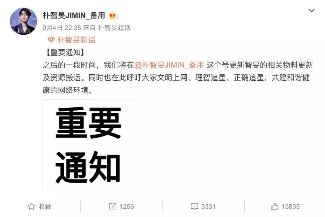 該賬號置頂的一條博文表示,之後的一段時間,**將在@樸智旻JIMIN_備用 更新樸智旻的相關物料更新及資源搬運。**同時也在此呼籲大家文明上網、**理智追星、**正確追星,共建和諧健康的網絡環境。