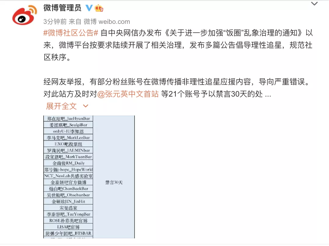 9月5日深夜,@微博管理員 再次發聲,第二波傳播非理性應援內容的賬號被禁言30天,其中包括@onlyU-IU李知恩 @吳世勳吧_Ohsehunbar @LISA吧官博 @防彈少年團吧_BTSBAR 等21個賬號。