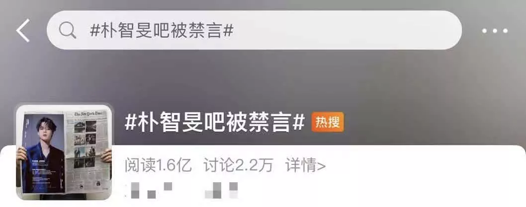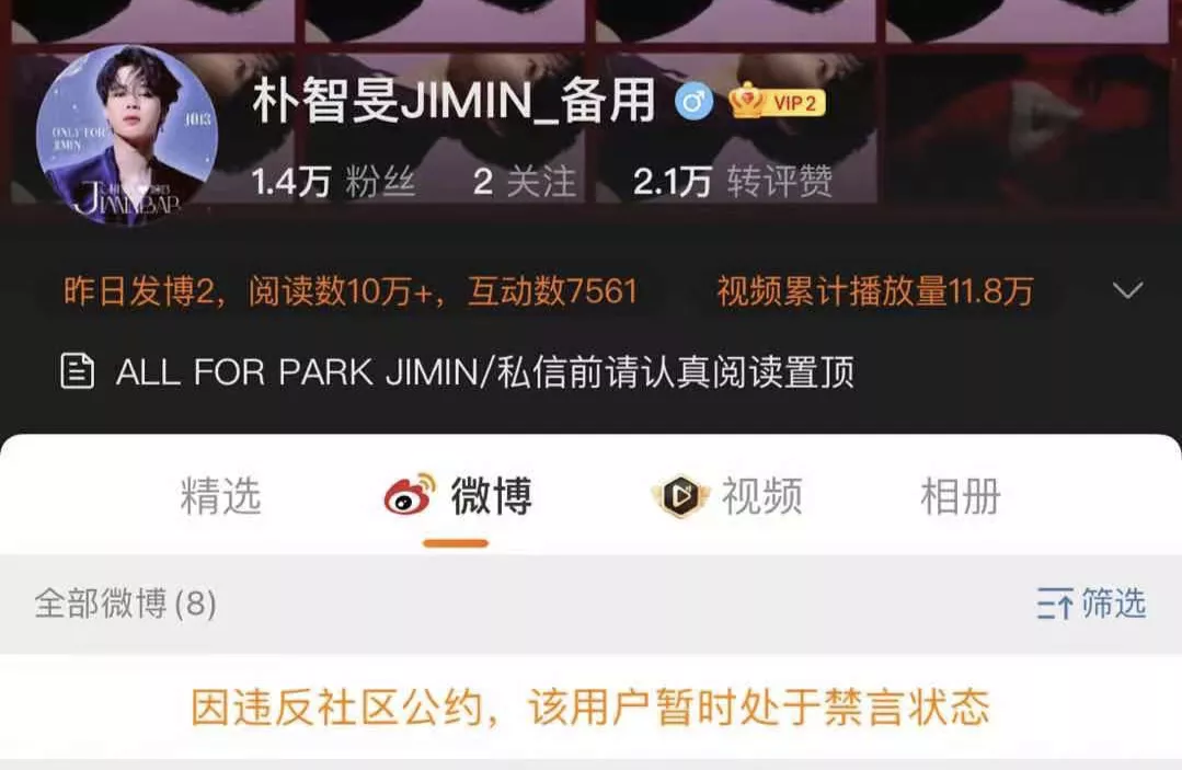 9月5日下午,繼“樸智旻吧”大號被禁言後,“樸智旻吧”備用賬號@樸智旻JIMIN_備用 狀態也顯示為:因違反社區公約,該用户暫時處於禁言狀態。