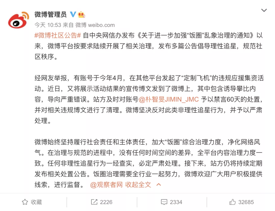 9月5日上午,@微博管理員 發佈社區公告,對賬號@樸智旻JIMIN_JMC 予以禁言60天的處置,並對相關違規博文進行了清理。