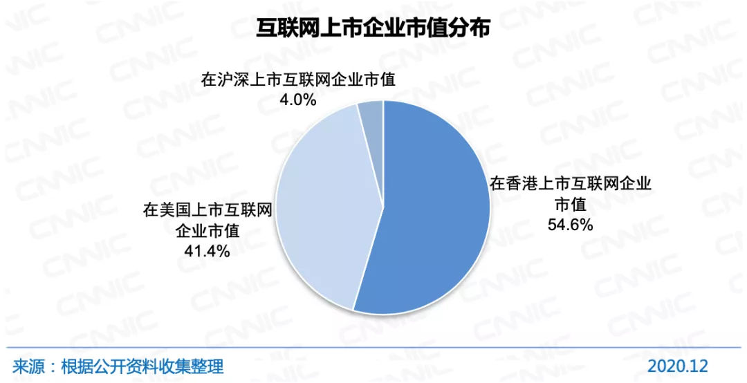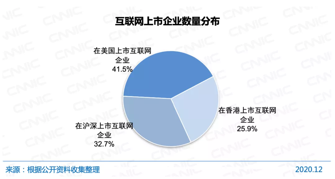 中國互聯網絡信息中心發佈的第47次《中國互聯網網絡發展狀況統計報告》顯示,截至2020年12月,中國境內外互聯網上市企業總數為147家(該數據含二次上市企業,為未去重數據),其中在滬深、香港、美國上市的互聯網企業數量分別為48家、38家、61家。