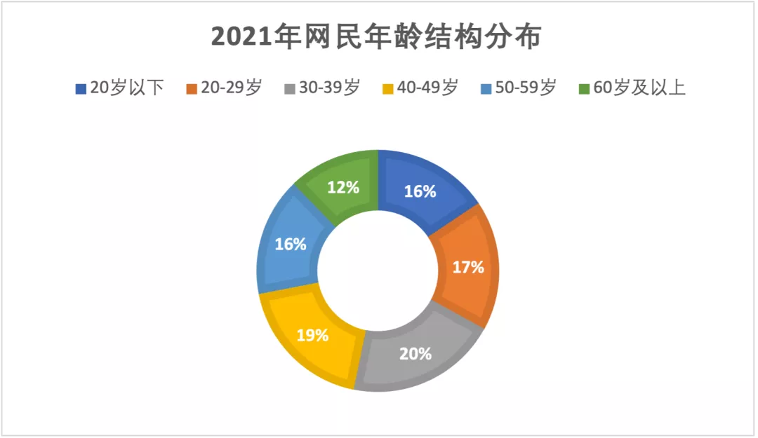 • 2016年,40歲以下網民在網民總數中佔比78%;2021年,40歲以下網民在網民總數中佔比53.3%。