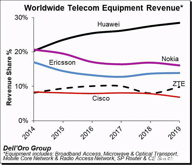 知名市場調研機構Dell’Oro公佈的2020年全球第四季度5G通信設備市場份額數據報告顯示,華為排名第一,愛立信、諾基亞分列二三名。