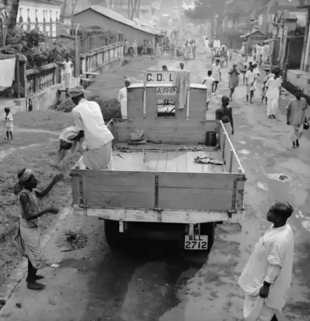 圖為1943年饑荒中,加爾各答清理屍體的卡車,圖源:the Guardian網站