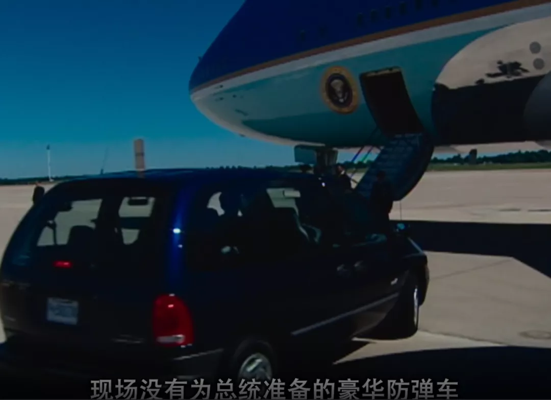 空中一號臨時降落的某軍事基地,機場密佈裝滿導彈演習的軍機,臨時也找不到總統級別的有防彈車輛,臨時派出一部普通小麪包車,結果不安的司機接到“可能成為攻擊目標”的總統後,在機場“飆車”,反而是小布什趕緊安撫司機為了安全要開慢車。