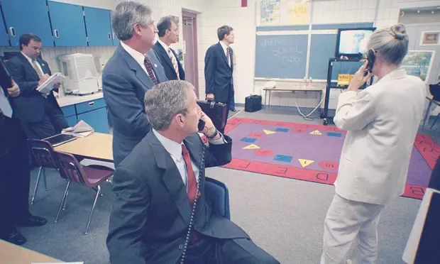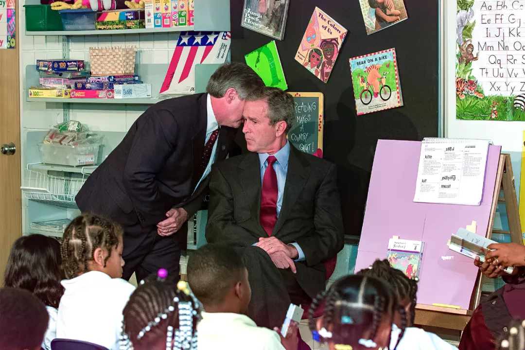 小布什在小學課堂獲得部下通報第一架飛機撞向世貿中心,故作鎮靜