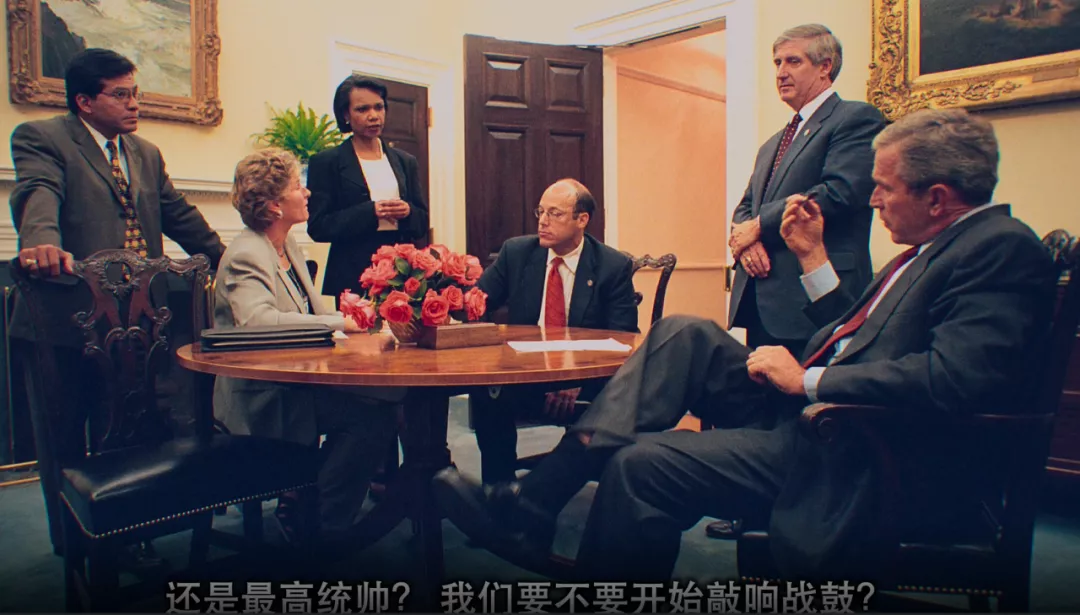 當然,整部紀錄片也詳細鋪墊了,小布什在小學會客室,親眼目睹電視屏幕上,第二架飛機襲擊世貿大樓的場景,恐懼和悲傷瀰漫了整個畫面,其後,所有白宮幕僚團隊都熟悉的一名犧牲者,電視評論員芭芭拉·奧爾森,也是司法部副總檢察長特德·奧爾森的妻子,已經在撞向五角大樓的77號航班中喪生的消息,更是加劇了這一情緒。