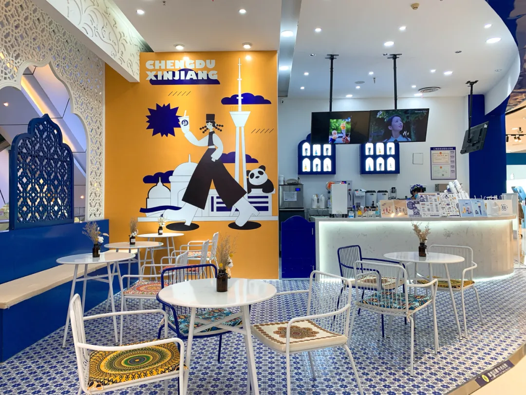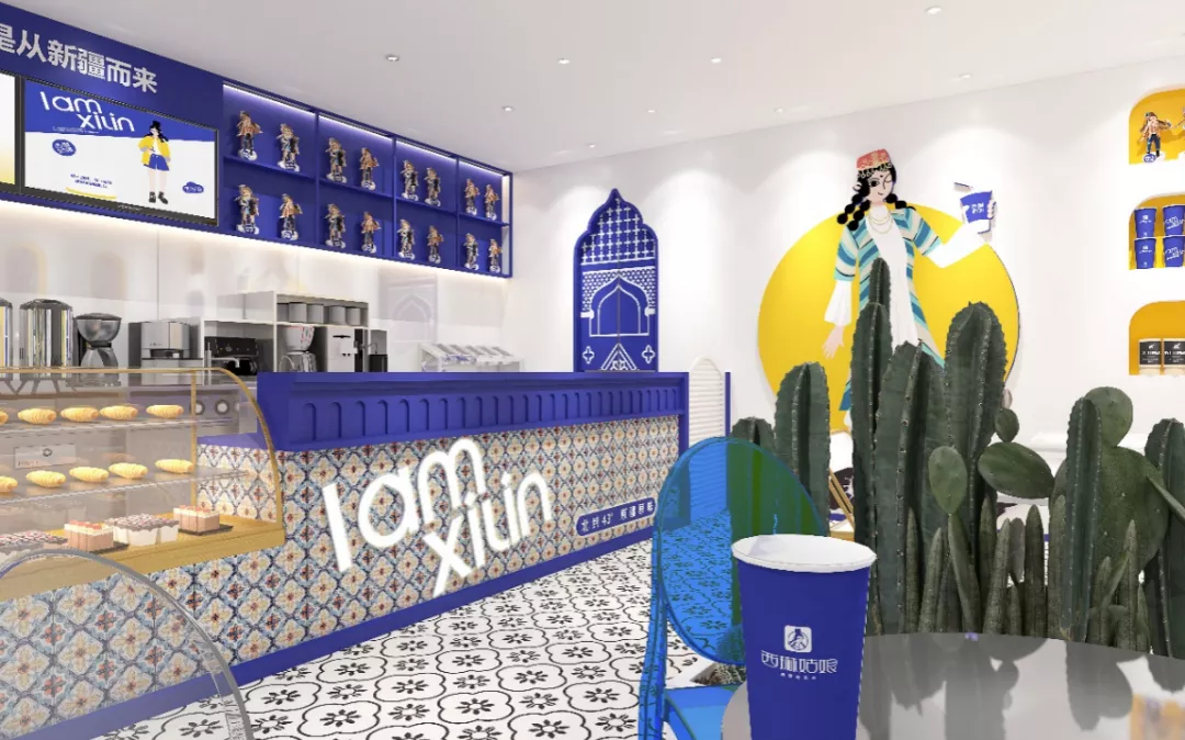 主題色選擇的是在伊犁大街小巷都會見到的、民居常用的藍色,門店的牆面插畫、地板紋飾、軟裝拱門等,都從新疆建築中提取靈感,甚至還專門製作了100多個形態各異的新疆小姐姐手辦,放在門店作為裝飾。