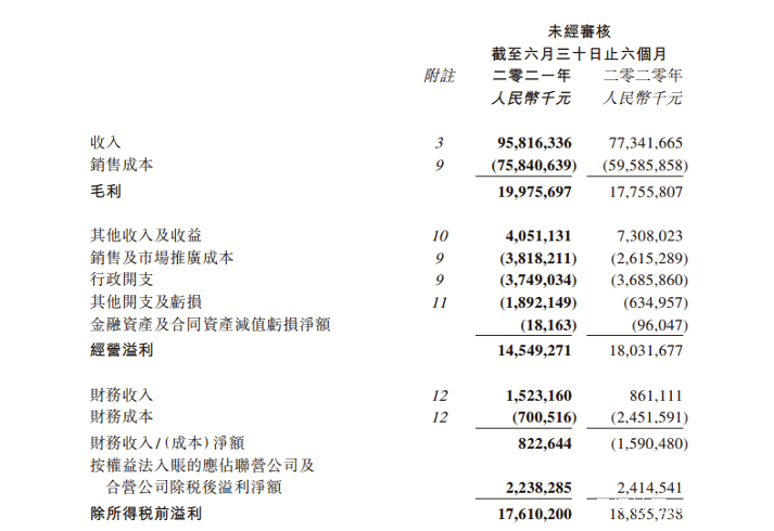 年中報顯示,融創中國上半年合同銷售額3208億元(人民幣,下同),同比上升64%;營業收入958.2億元,同比上升23.9%;毛利199.8億元,同比上升12.5%;歸母淨利潤119.9億元,同比上升9.4%。