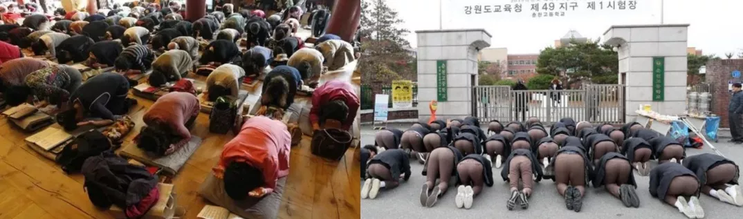 每到考試時期,學生們要跪地祈禱,父母要去去教堂寺廟祈求好運。