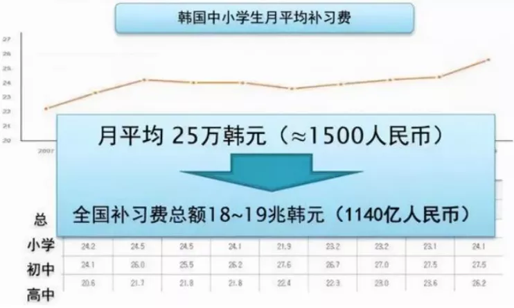 韓國人口5200萬左右,有近10萬家課外輔導機構,市場規模33萬億韓元,超過韓國軍費預算的一半!