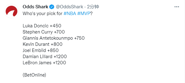 近日,關於NBA新賽季MVP的賠率已經出爐,東契奇以+450高居第一。