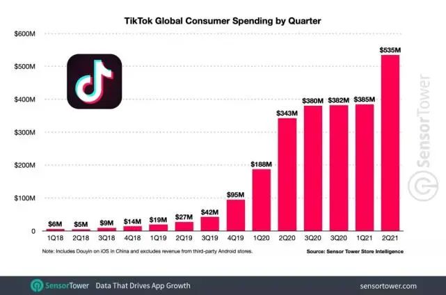 不過,即便遭遇監管打擊與巨頭的抄襲幾家,Tik Tok一路高歌猛進。根據Sensor Tower的最新數據,TikTok 是2021 年上半年全球下載量最大、收入最高的非遊戲應用程序。今年第二季度,TikTok 的消費者支出實現了自 2020 年第二季度以來最大的環比增長,從上一季度的 3.847 億美元攀升 39% 至 5.346 億美元。
