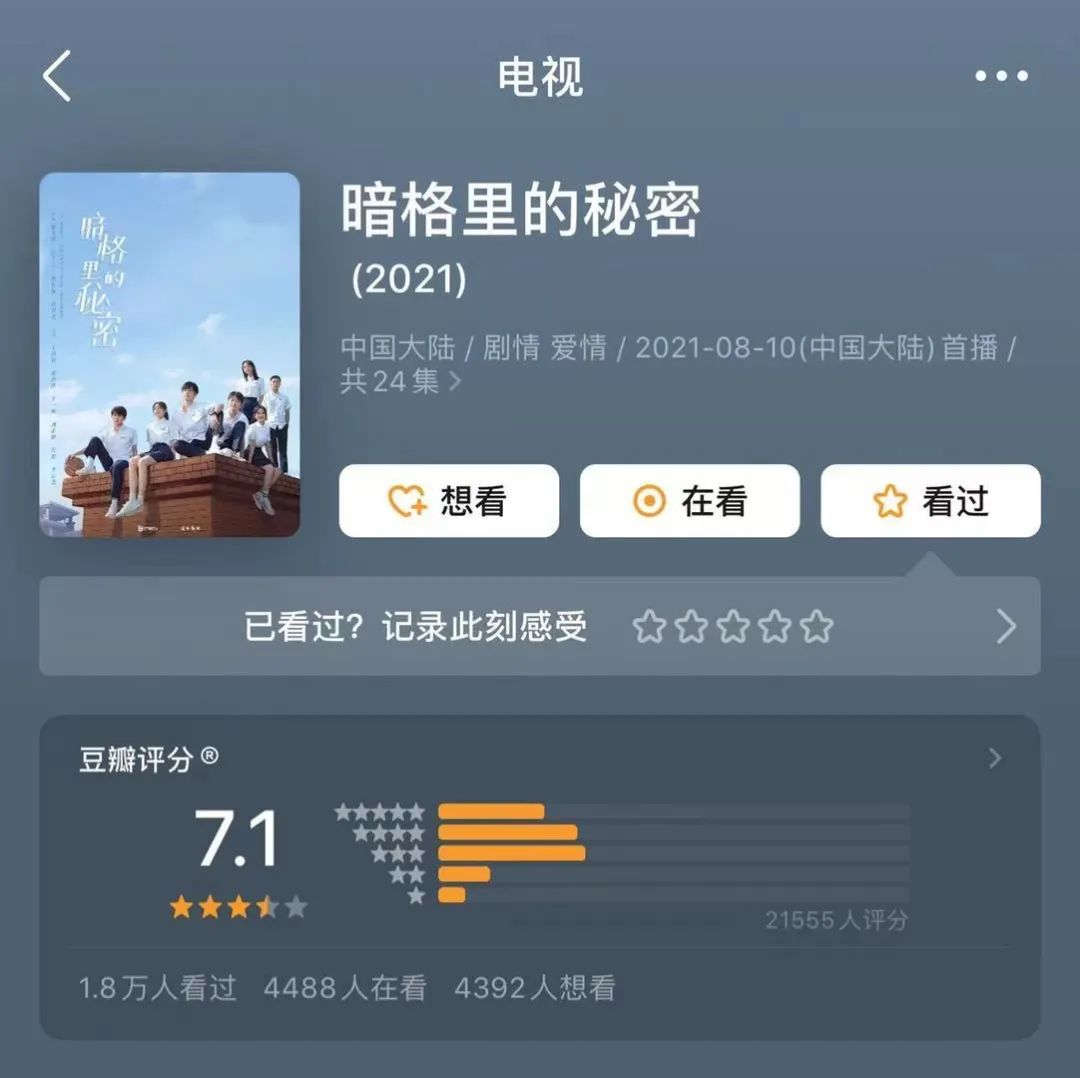 芒果TV獨播的《暗格裏的秘密》是暑期檔青春劇中的佼佼者,在播出半個月裏,一路口碑看漲,最高到達7.1分。同樣在大劇林立的後暑期檔裏,這部劇數度衝進德塔文在播劇景氣指數日榜Top10中。