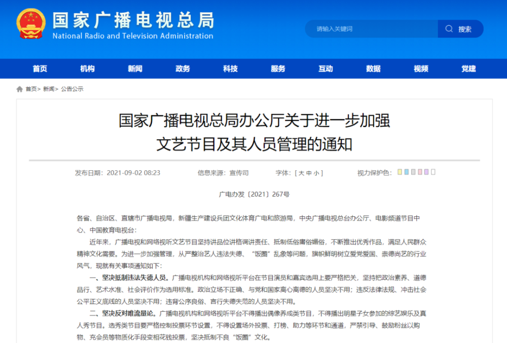 9月2日,國家廣播電視總局發佈了《關於進一步加強文藝節目及其人員管理的通知》(以下簡稱《通知》),提出“堅決抵制違法失德人員 ”“堅決反對唯流量論”“堅決抵制泛娛樂化”“堅決抵制高價片酬”“切實加強從業人員管理”“開展專業權威文藝評論”“充分發揮行業組織作用”“切實履行管理職責”八條事項。
