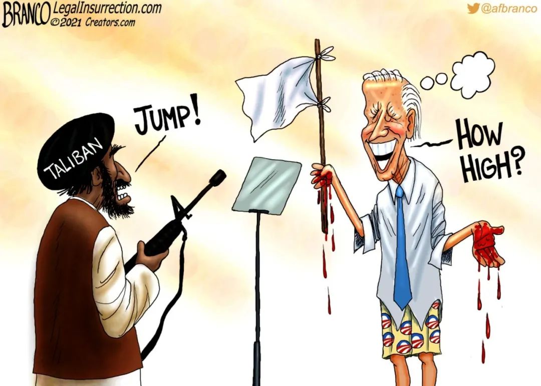 沒有白來的錢財,也沒有無緣無故打的仗。拜登現在説這種便宜話,就像一個人吃飽喝足後抹抹嘴説,以後別再這樣浪費了!可是倒回去幾個鐘頭,你不給他吃喝,他還有力氣這麼裝嗎?不能想象,如果拜登面對這些中東和中亞刺兒頭,當面對大麻煩時,他還有沒有勇氣和膽魄去拔掉這些釘子。美國漫畫家瞭解拜登,畫中的塔利班用AK47對着拜登,喊,跳!拜登舉着白旗答,要跳多高?