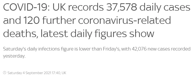 據Sky News 9月4日報道,英國在過去24小時內新增37,578例COVID-19病例,和120例死亡病例。