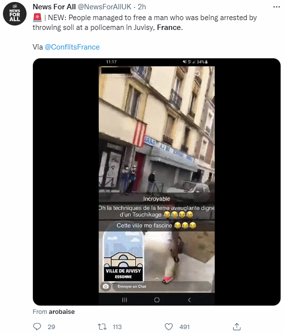 有大規模遊行就會有衝突。在法國Juvisy市街頭,有一名男子被警方逮捕,按在地上。其他人為了解救被捕男子,竟然隨手抓起沙土,就往警察身上撒。