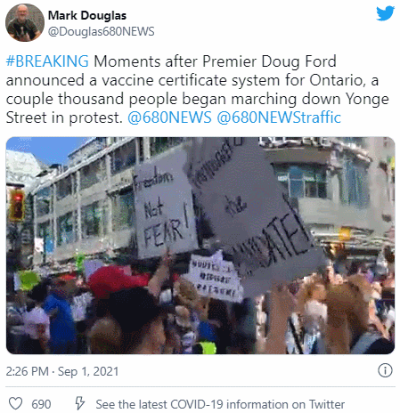 此外,安省政府計劃在9月22日實施疫苗證計劃。跟法國巴黎一樣,安省多倫多大批民眾立即舉行遊行活動,抗議政府這種限制自由的舉措。