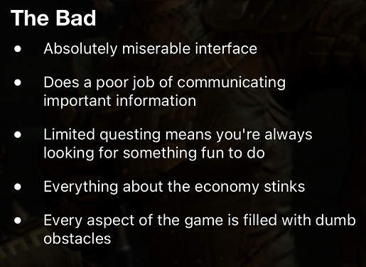 此外玩家們還列舉了大量的問題,比如劇情太單薄、沒有小地圖、反人類的市場交易、神經病的生產採集系統等等。