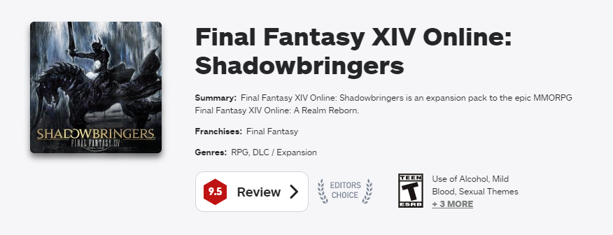 在 IGN ,《 最終幻想XIV :漆黑的叛逆者》的評分高達 9.5 ,是遊戲界評分最高的 MMORPG ,沒有之一。