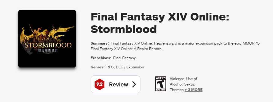 第二名呢?抱歉,還是《 最終幻想XIV 》,4.0 版本的《 紅蓮之狂潮 》,9.2 分。