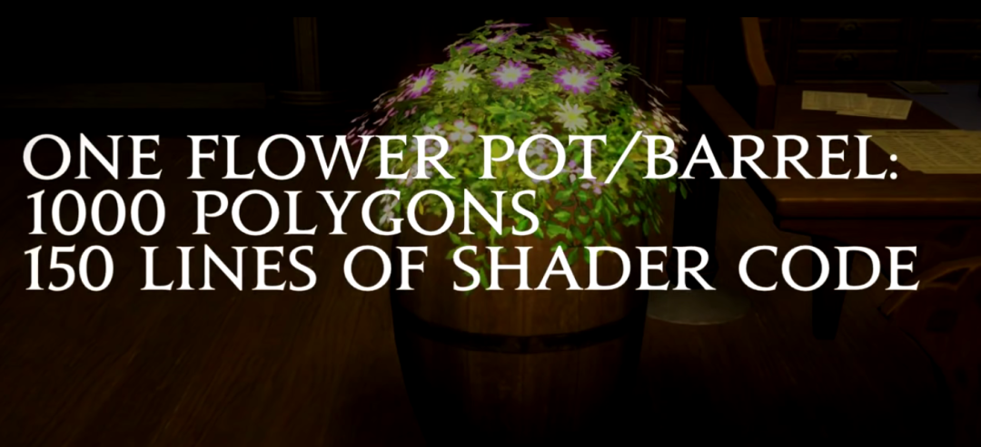 這得益於遊戲團隊對於他們的審美有着謎一樣的執着,他們喜歡在城裏擺上大量的花盆,一個花盆有一千個多邊形, 150 多行代碼,幾乎和一個角色模型的數據差不多。