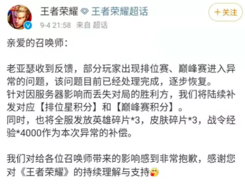 9月3日是防沉迷新規實施後首個未成年人獲准遊戲時間,尚無玩家反映遊戲問題。9月4日晚間,有玩家網友反映稱,王者榮耀App一直無法進行遊戲匹配,遊戲中途會出現轉圈現象,無法繼續進行遊戲。