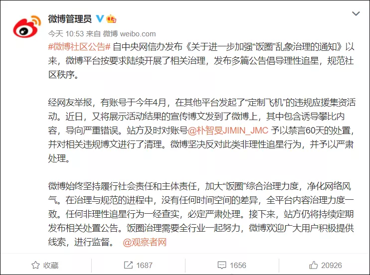 經網友舉報,有賬號於今年4月,在其他平台發起了“定製飛機”的違規應援集資活動。近日,又將展示活動結果的宣傳博文發到了微博上,其中包含誘導攀比內容,導向嚴重錯誤。站方及時對賬號@樸智旻JIMIN_JMC 予以禁言60天的處置,並對相關違規博文進行了清理。微博堅決反對此類非理性追星行為,並予以嚴肅處理。