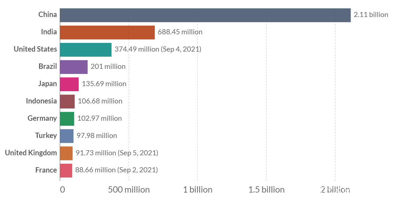 截止2021年9月6日,中國大陸累計接種新冠疫苗21.1308億劑,繼續位居全球第一位,佔全球累計接種劑數的38.3%;其中單日新增接種564萬劑,繼續下滑,創5月5日以來新低,佔全球單日接種劑數的24.3%。中國至少接種一劑的人羣佔比為77.6%;完成接種的人羣佔比為68.7%,這兩項指標均位居世界主要大國之首,高於加拿大的73.9%和67.5%。中國每百人累計接種149.68劑,環比增加0.40劑,是美國的1.34倍,位居世界主要大國之首。