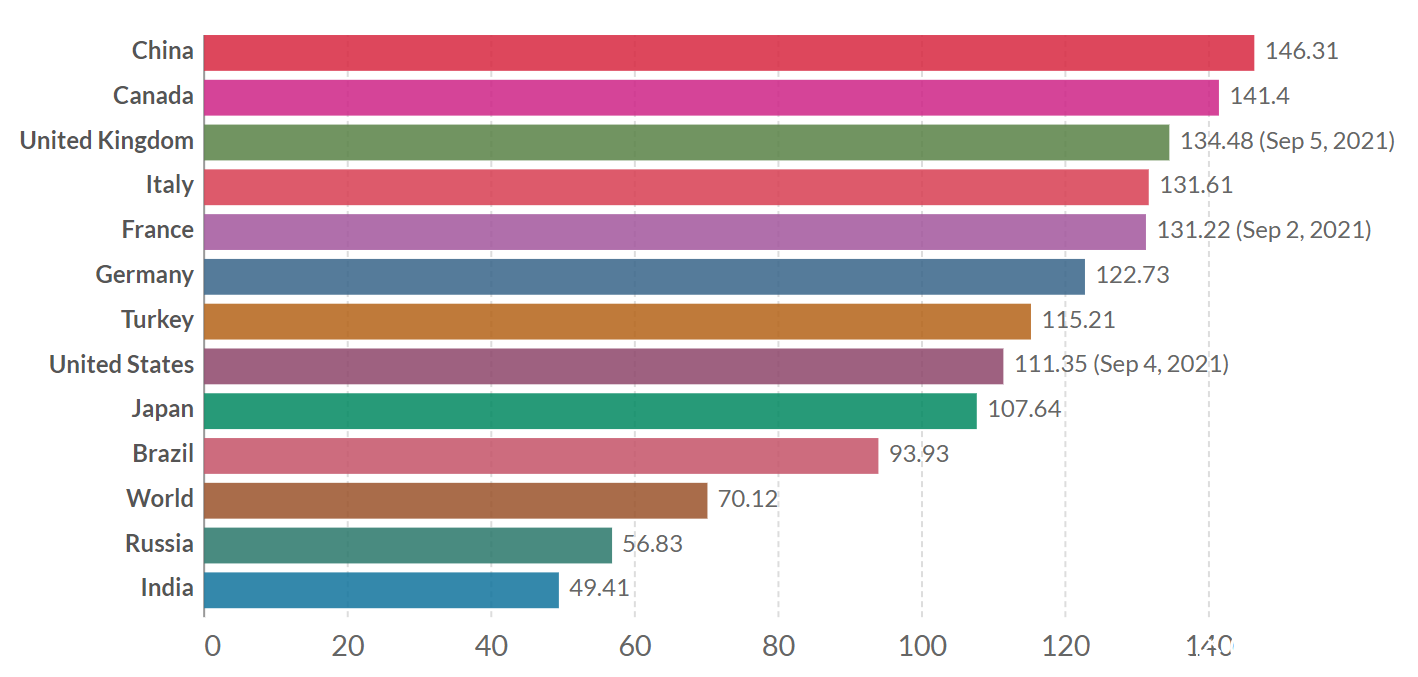 截止2021年9月4日,美國累計接種3.7449億劑,居全球第三位,其中單日新增接種97萬劑。美國至少接種一劑的人羣佔比為61.5%;完成接種的人羣佔比為52.3%。美國每百人累計接種111.34劑,比中國低37.43劑,是中國的74.8%(美國數據未更新)。