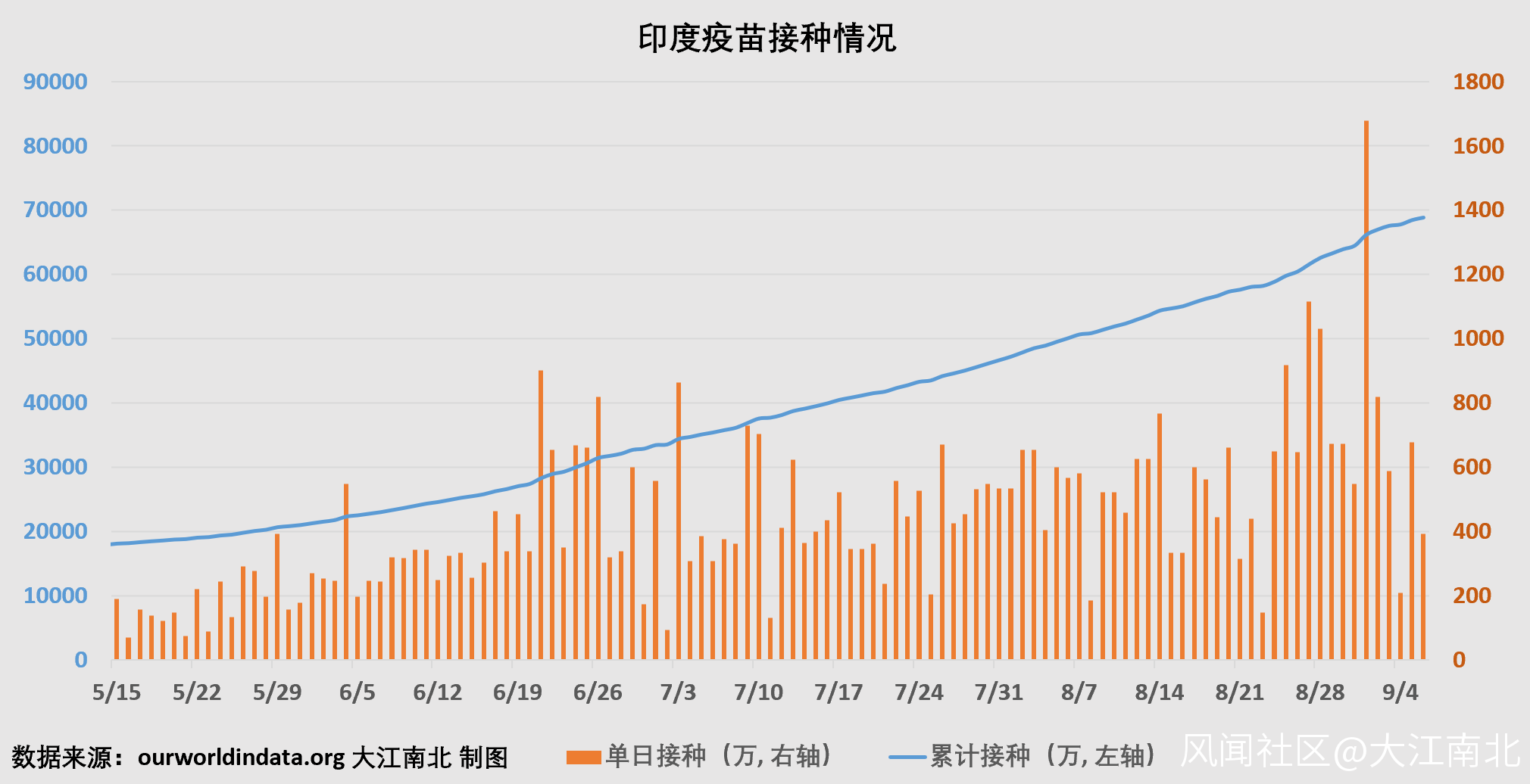 截止2021年9月6日,印度累計接種6.8845****億劑,列第二位,**其中單日新增接種393萬劑。**印度至少接種一劑的人羣佔比為37.9%,完成接種的人羣佔比為11.5%。印度每百人累計接種49.13劑,是中國的32.9%。