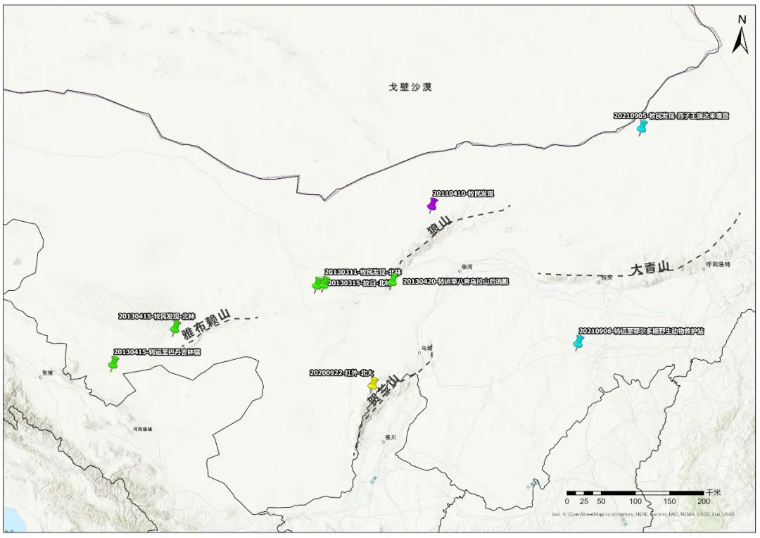 2011年以來,內蒙古4只雪豹個體的野外記錄位點 圖片提供:陸橋生態中心 李禕斌
