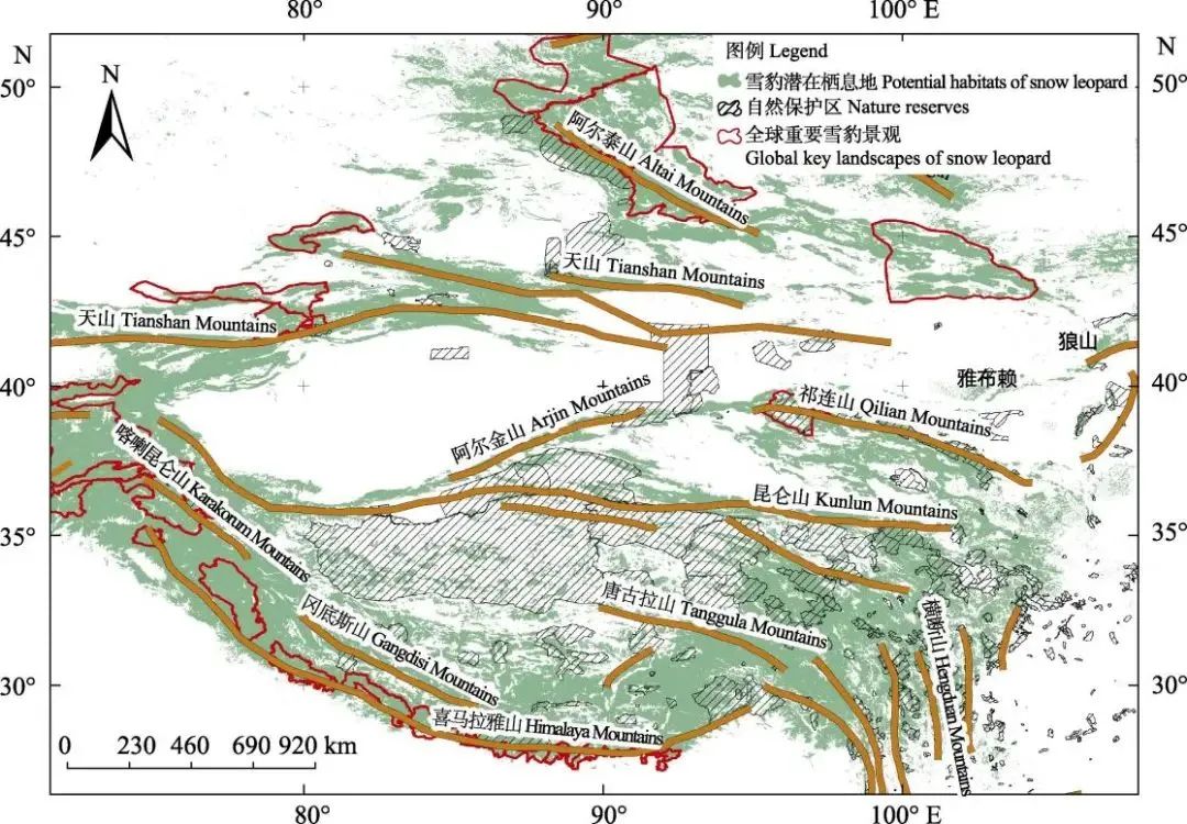 雪豹潛在的棲息地 底圖出自:《生物多樣性》Ongoing threats and the current status of snow leopard conservation in China