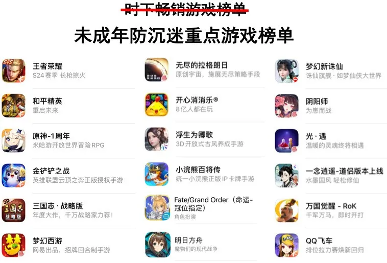 所有網絡遊戲,關鍵是所有!!!不管你是頁遊還是手遊,不管你是王者榮耀原神陰陽師等大型遊戲,還是開心消消樂鬥地主等休閒小遊戲,不管遊戲是面向寶寶還是面向姥姥,只要是個網絡遊戲,未成年就都沉迷不了!