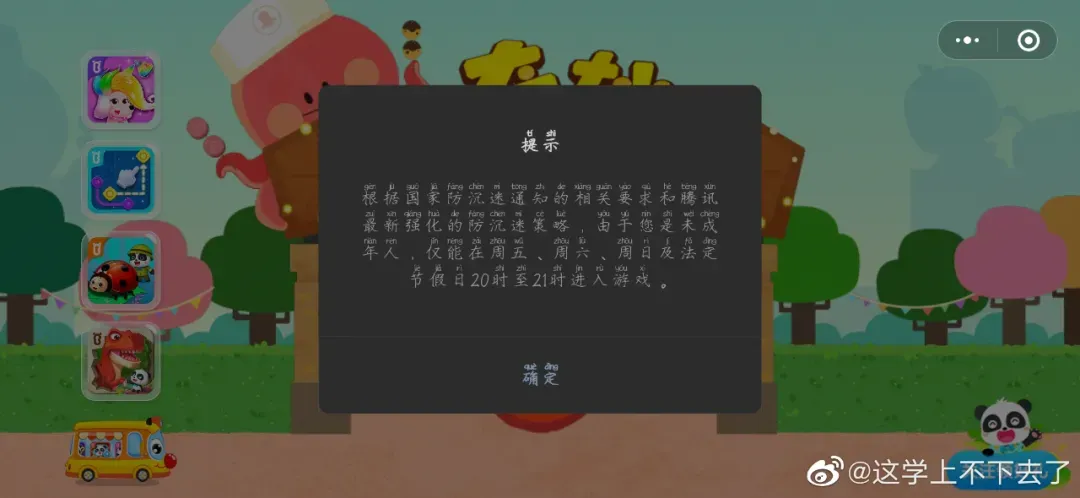 據説主要功能是兒童啓蒙的寶寶巴士,現在也未成年防沉迷。看到下面這張帶拼音的防沉迷通知時,我真的蚌埠住了,看來這遊戲只能給18+的寶寶玩了