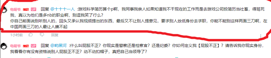 經過幾天瞭解,發現這個up掛人成癮,時不時就要把別人的言論掛出來評論一番,引起眾怒後又把不理智的人挨個舉報拉黑,對不認可自己行為的人表示你有什麼資格不認可我,你現實裏是什麼身份,你是檢察官還是紀委?