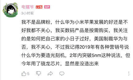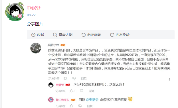 之前華為p50公佈後,因為某些大家都知道的原因,b站某up表示了自己對華為一直以來的支持和喜愛,表示自己未來會一直支持華為,因為自己深愛着這個國家。之後b站粉絲三萬的大up“電鋸爺”在其下方回覆“p50用的驍龍888,這怎麼説?”並同時將之掛在自己的動態任人欣賞,根據電鋸爺所説,美其名曰“我就是看見這人原地沸騰,買華為愛國挺搞笑的,掛出來給大家樂呵樂呵,沒有別的意思,沒想到他居然罵我”事後愛國者因罵人被b站以封號懲罰,本身事件到此為止也罷了。可是我們的電鋸爺依舊不滿,將愛國者私信侮辱他的言論和自己投訴b站將他封號的記錄擺出來供大家欣賞,於是有了後續大量支持華為的粉絲和看不慣up掛人潑冷水的路人來電鋸爺的動態下面評論,中間經歷兩週左右中間過程大家有興趣可以自己去欣賞,中間電鋸爺發表了許多經典的言論總結一下: