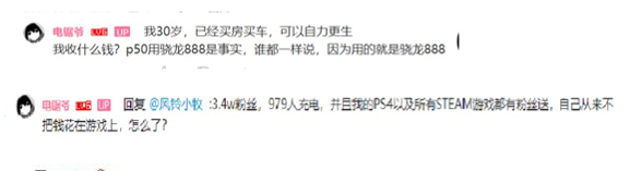 2.有人質疑up收錢故意收錢抹黑華為,up表示我有車有房,是某執法單位的法律顧問可以自力更生,又對另外質疑者回復我3.4w粉絲,遊戲全部有人送,從來不用把錢花在遊戲上。