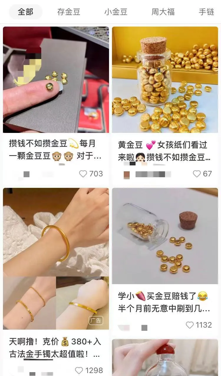 小紅書則是最好的種草平台。在小紅書搜索“金”、“金產品”、“金豆”分別有着超582萬篇、超20萬篇、超5萬篇相關筆記。大量年輕用户曬出自己的黃金收藏,從小金豆到金鍊子,從小掛墜到金戒指,越來越時尚化的設計,越來越日常的搭配。