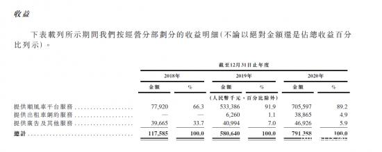 但也因為如此,嘀嗒對順風車業務收入的依賴逐漸加大,從營收結構來看,順風車服務費、出租車服務費、廣告及其他服務是嘀嗒營收的三大來源,順風車平台收入在總營收中的佔比最大,從17年的56.6%,一直增加至去年的89.2%,最高達91.9%。