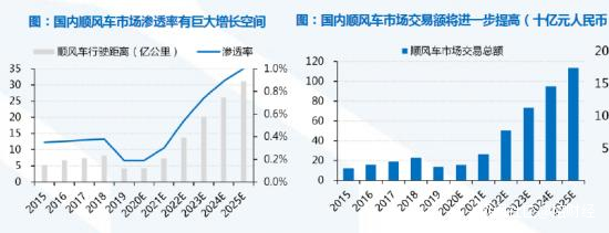 數據顯示,15-18年國內順風車市場交易額接近翻倍,預計2025年順風車潛在市場規模將達到5,229億元人民幣,年複合年增長率為41.8%。可見,未來順風車市場的滲透率還有巨大的增長空間。