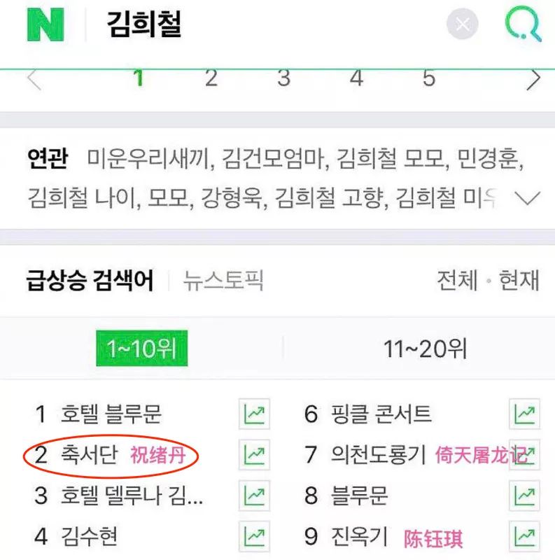 因為金希澈的狂熱,祝緒丹在中國沒上熱搜,反倒在韓國上了。